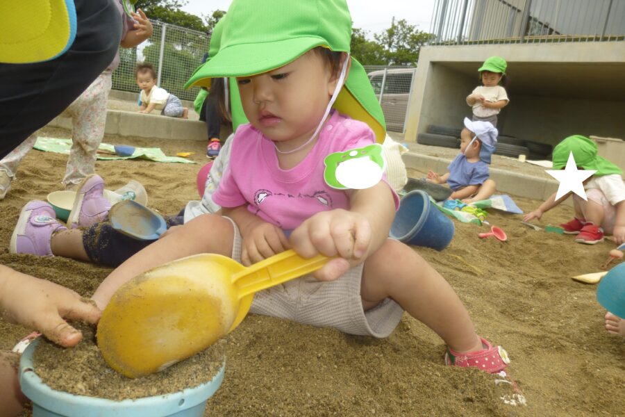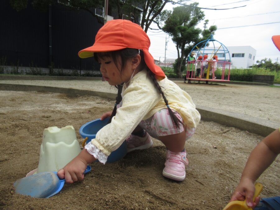 砂場遊びでは、バケツにたくさん砂を入れたり、