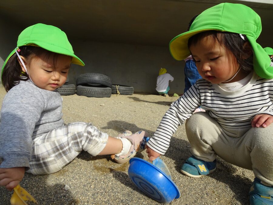 今日は今岡グラウンドと園庭に分かれて遊びました