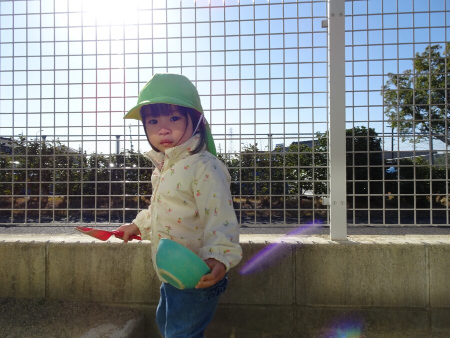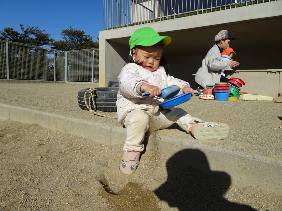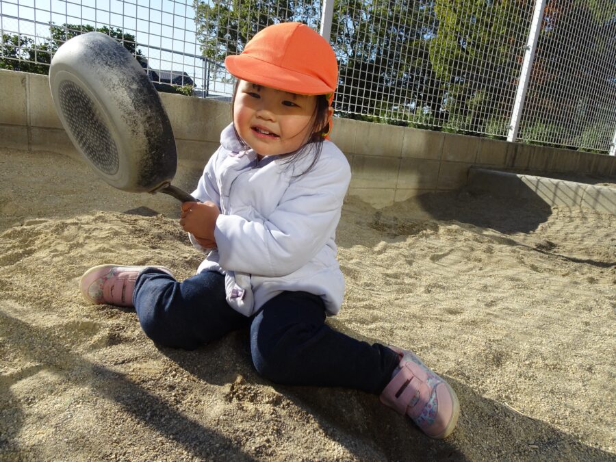 スコップとお皿を手に持ち、砂場で遊んでいました![]()