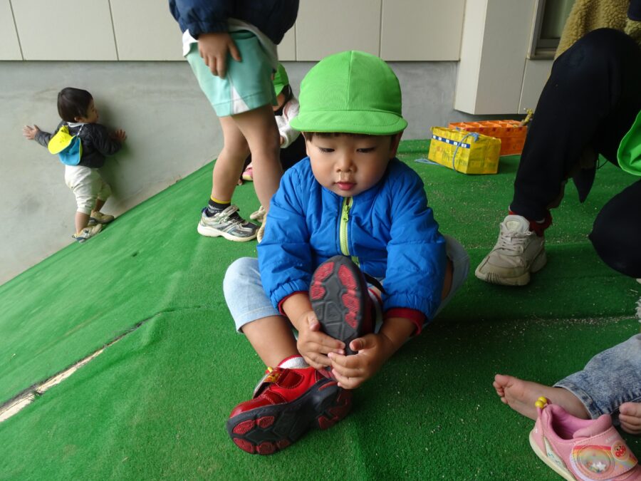 園庭では、自分で靴を履こうと頑張っている姿がありました