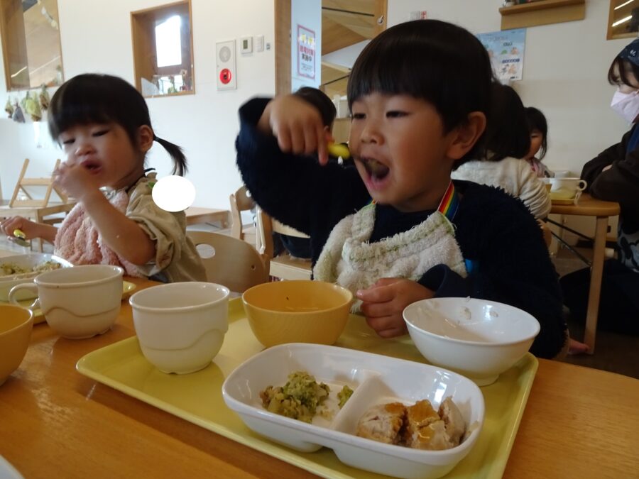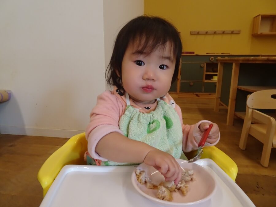「みてて~」と保育者に言い、大きなお口で食べる姿を見せてくれました
