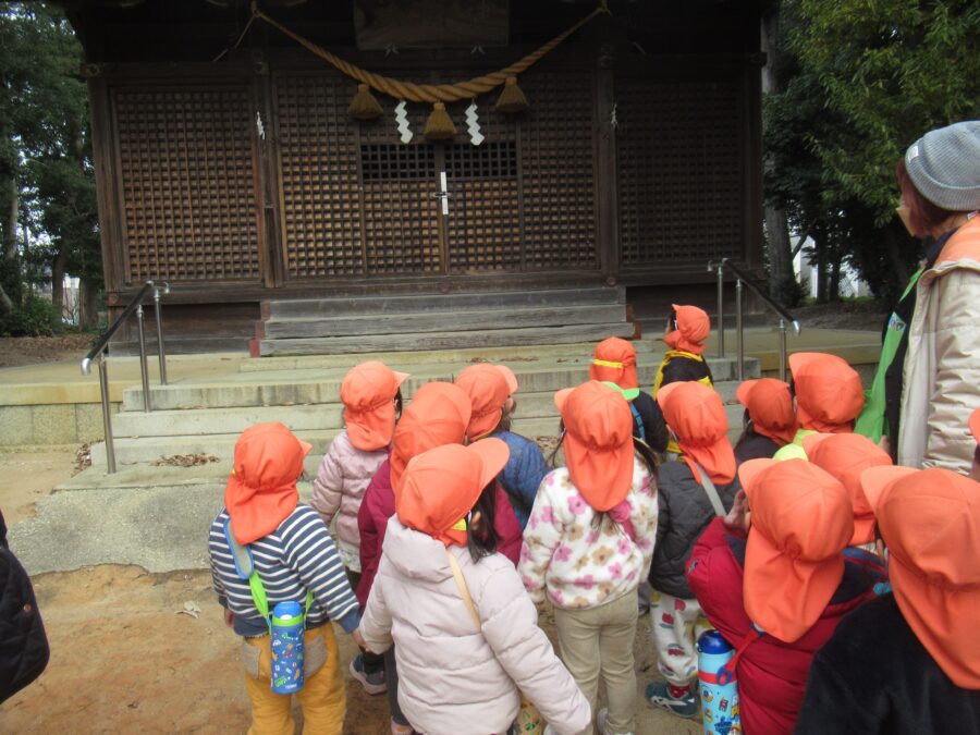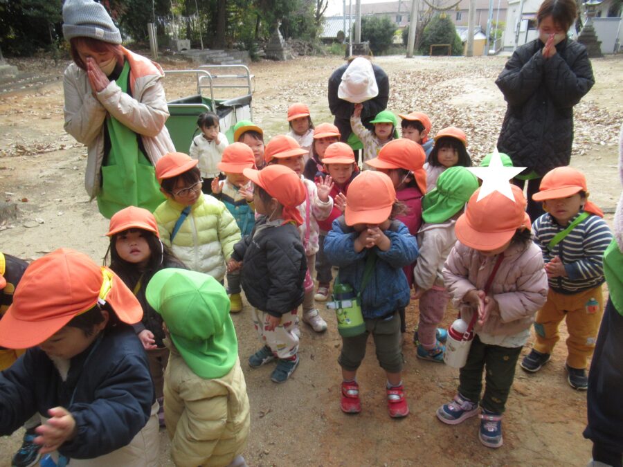 保育者の真似をして「二拝二拍手一拝」をしました
