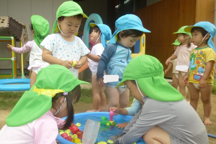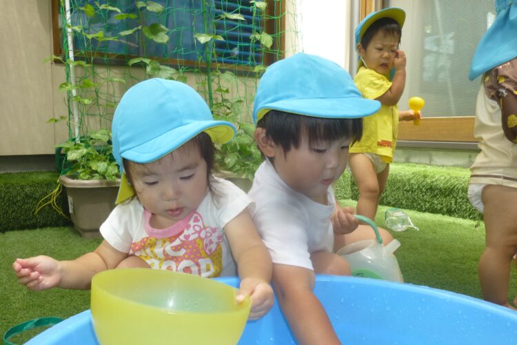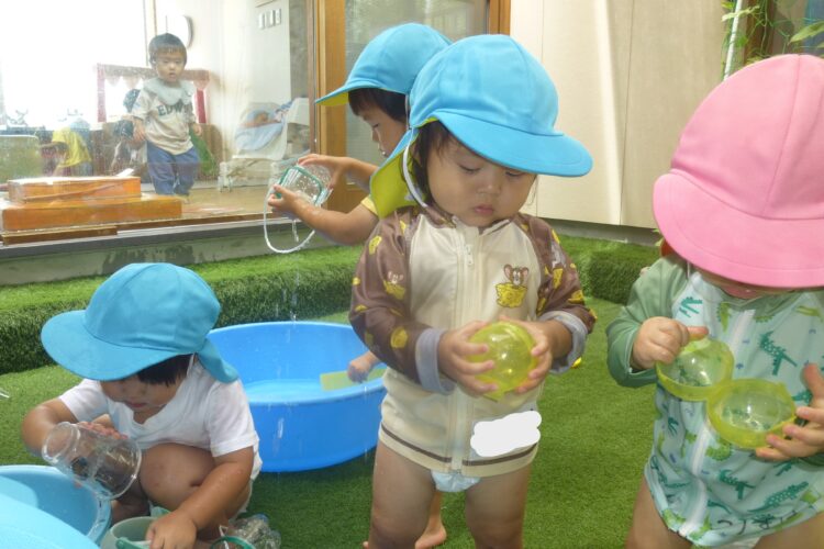 中庭でお水遊びをしているお友達もカップやカプセルシャワーで楽しんでいました