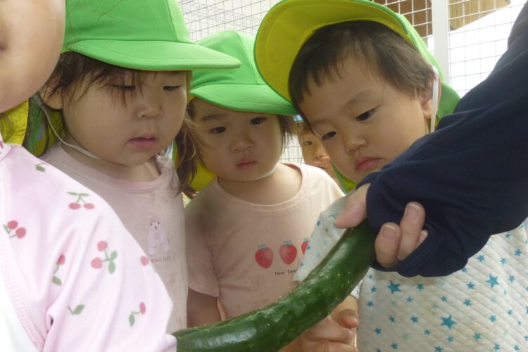 毎日みんながお水をあげてくれていたお野菜も大きくなってきて、きゅうりとオクラを収穫しました