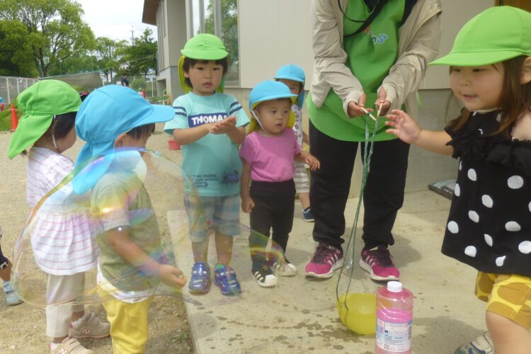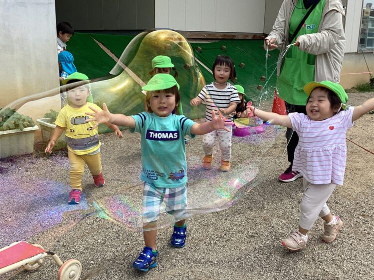 大きなしゃぼん玉を追いかけて大興奮です![]()