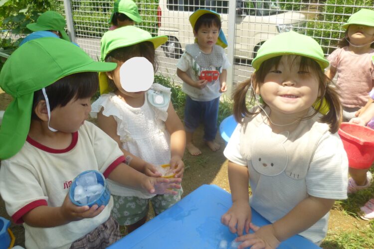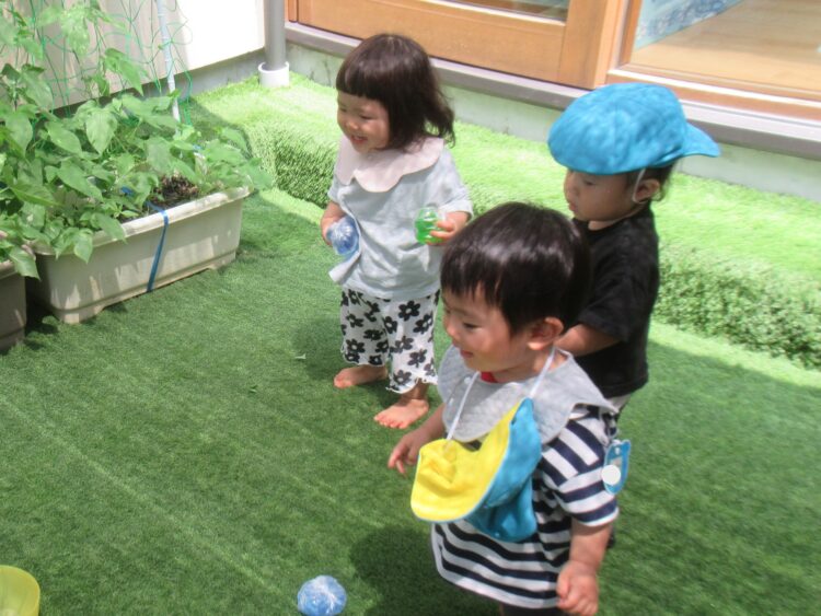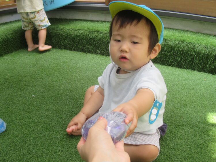その後は園庭で氷やお水の入った袋をもって感触遊びをしました!![]()