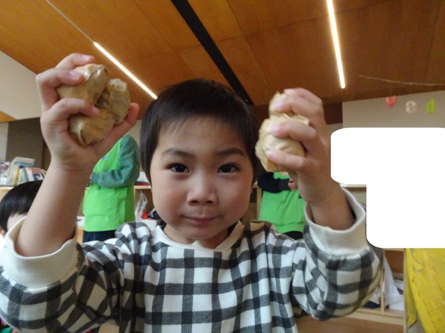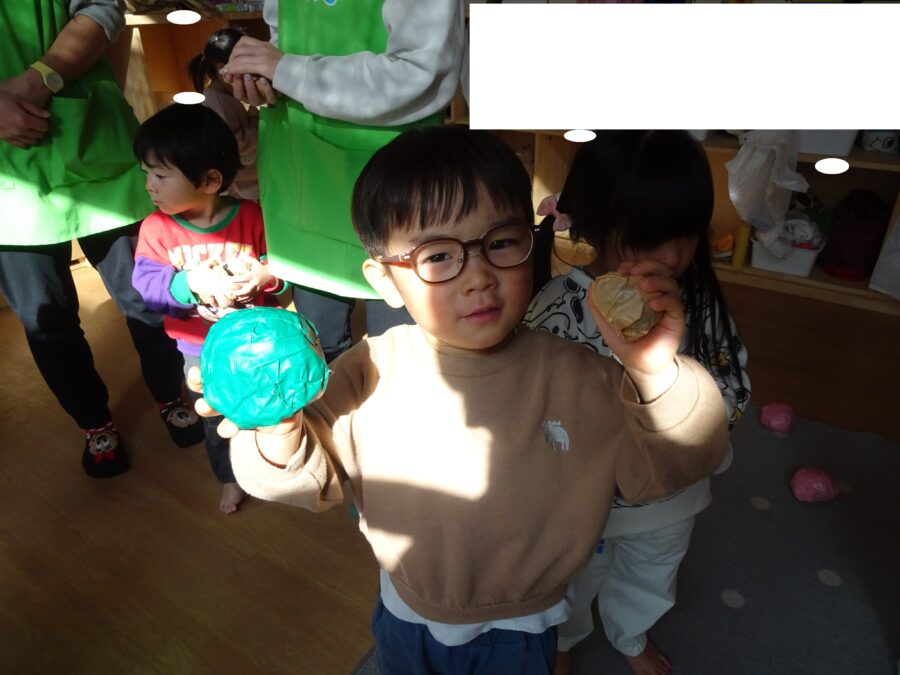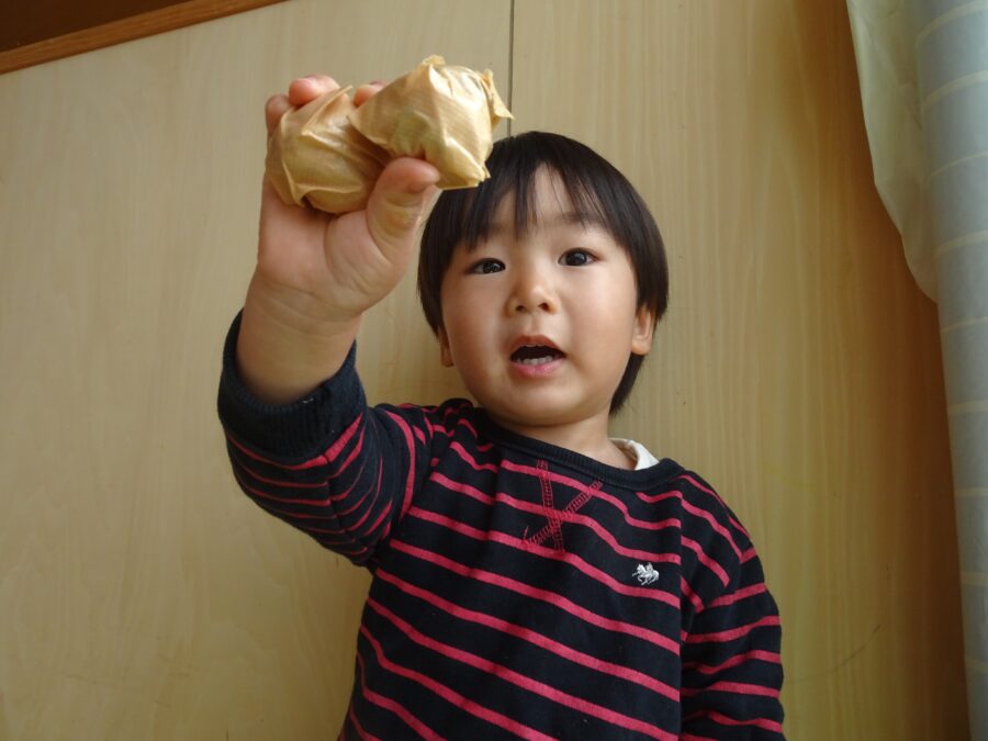 新聞紙で作られた豆を持って、準備バッチリ![]()