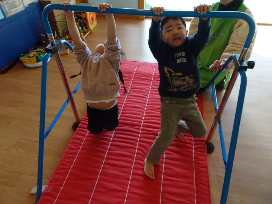 鉄棒では、腕の筋肉を使って一生懸命ぶらさがっていました![]()