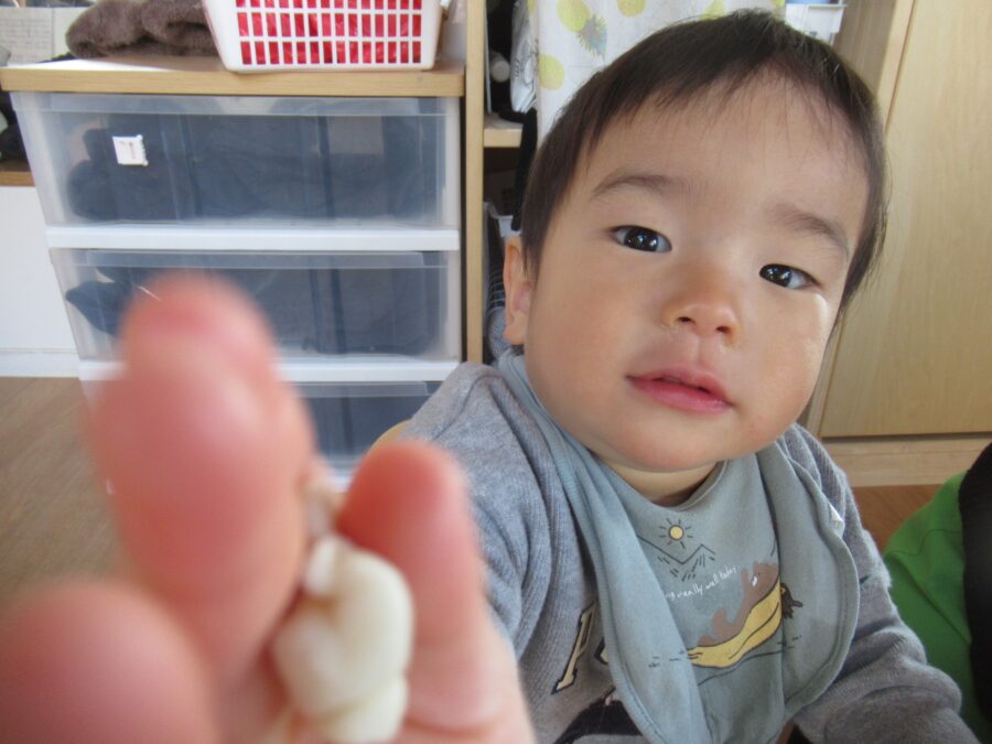 粘土を丸めて、手に持って保育者に見せてくれました👀