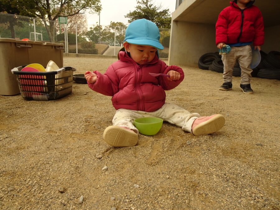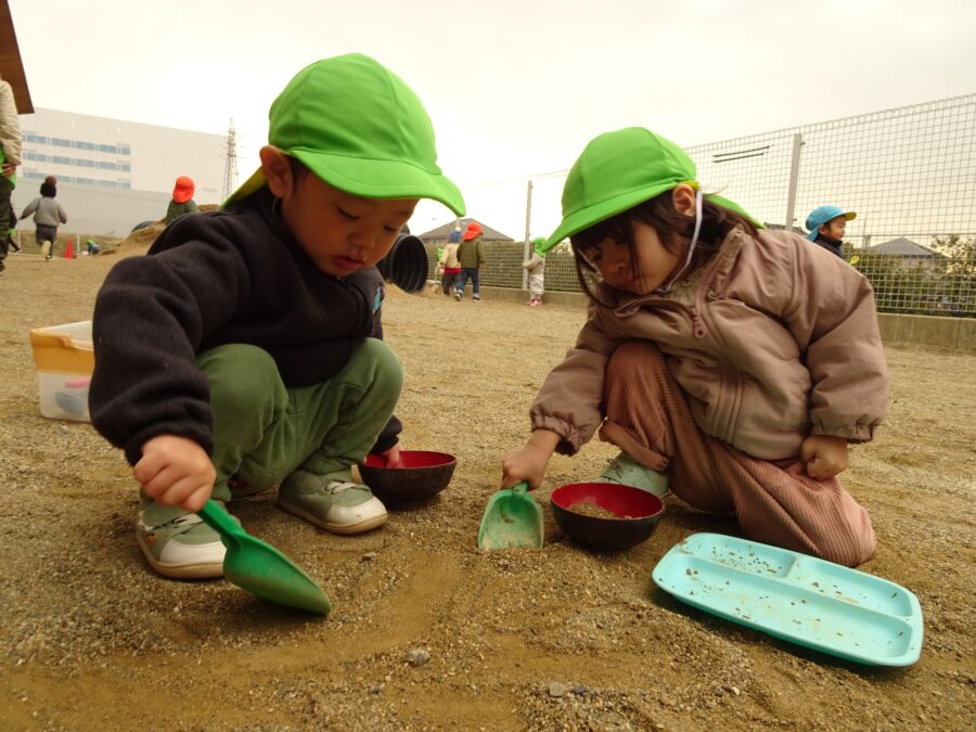 そして園庭組さんは湿った砂をお料理したり、バケツに集めたりして遊んでいました!