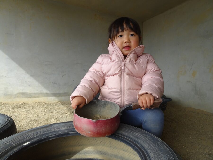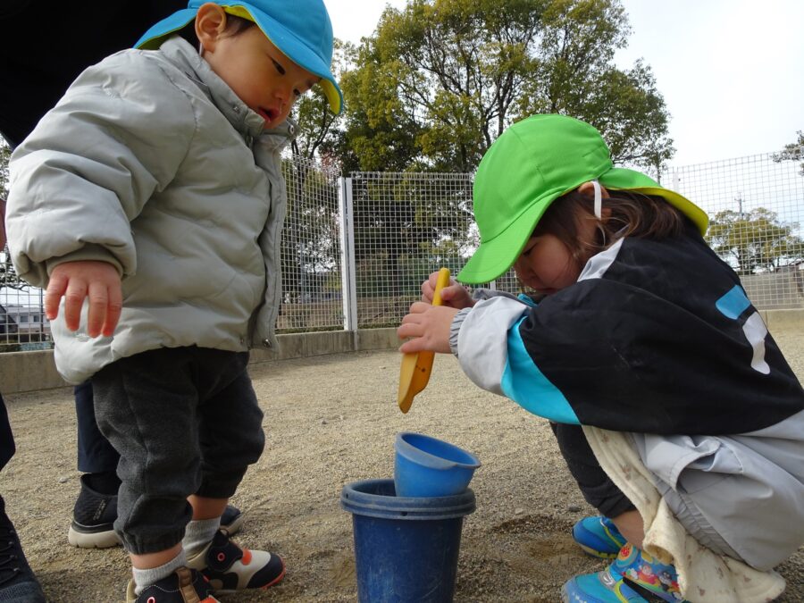 バケツの砂を混ぜ混ぜしてお料理をしていました![]()