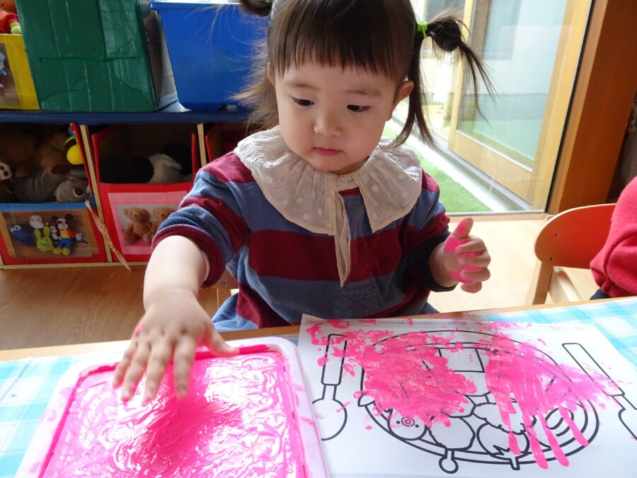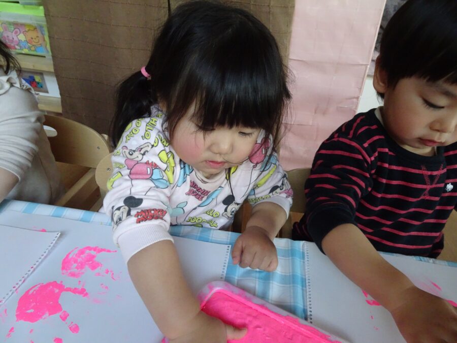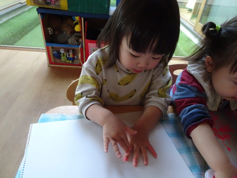 「私もやる!」とお友だちがやる姿を見て、たくさんお友だちが集まって手形を楽しんでいました![]()