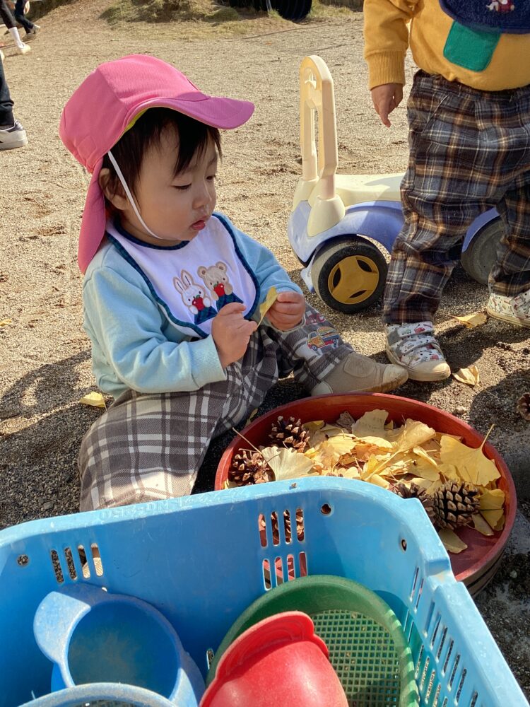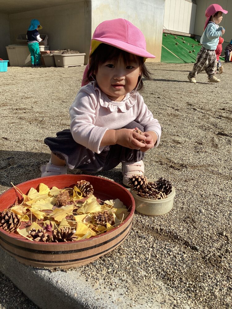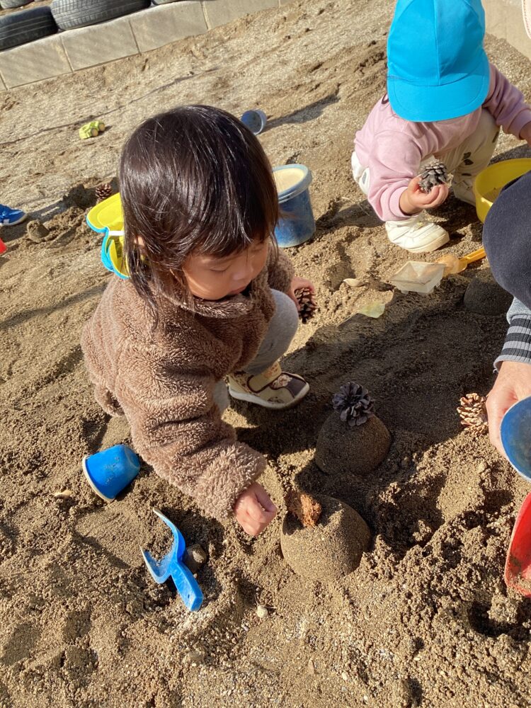 神社で拾ってきたまつぼっくりやイチョウの葉っぱを使って、みんなでケーキを作りました🎂