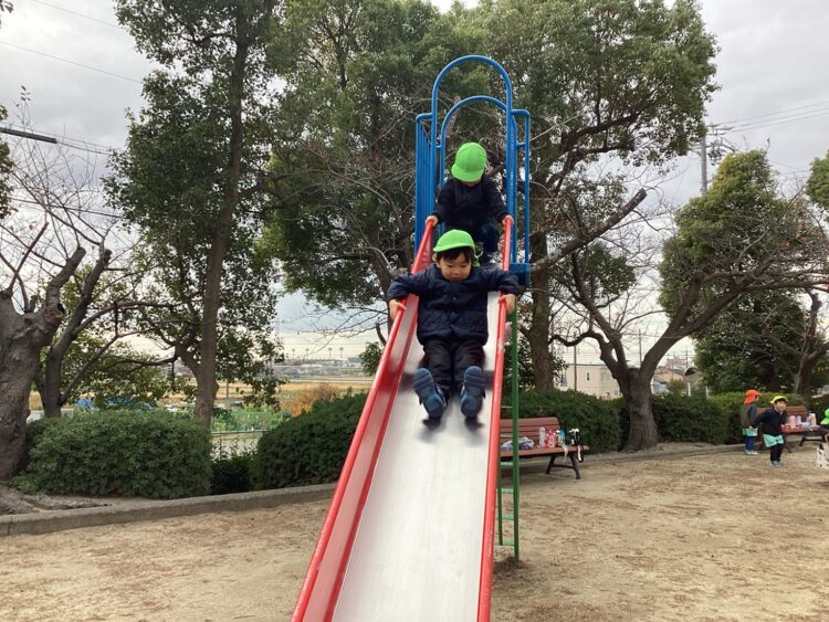 富士塚公園まで頑張って歩いて、色んな遊具で遊んだよ