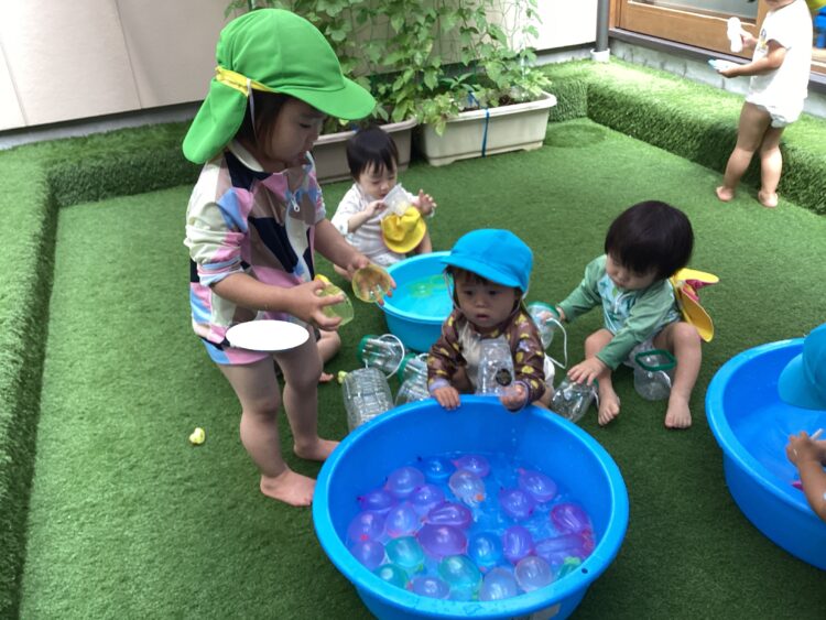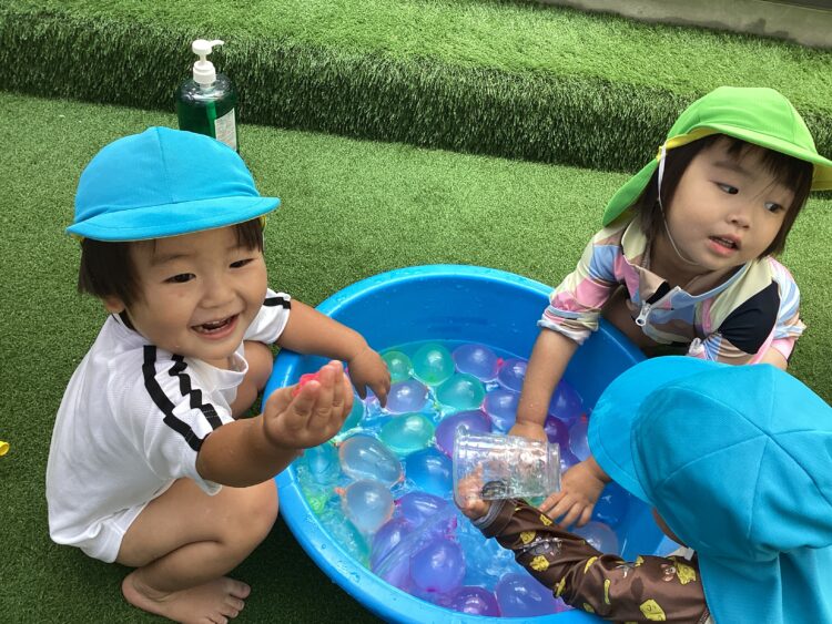 タライいっぱいの水風船を見て興味津々の子どもたち![]()