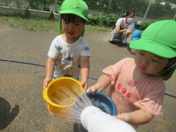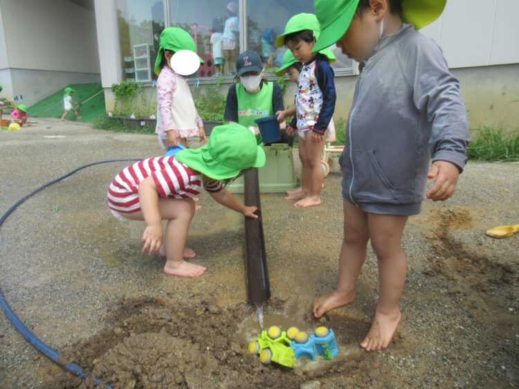 幼児園庭でも砂遊びや水遊びを楽しみましたよ![]()