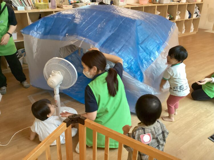 お部屋では、扇風機で風を吹き込ませて、手作りのビニールハウスが登場