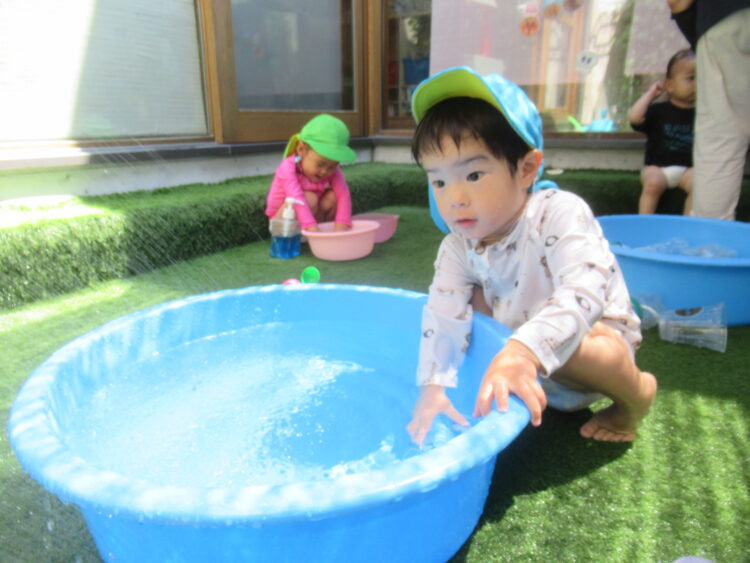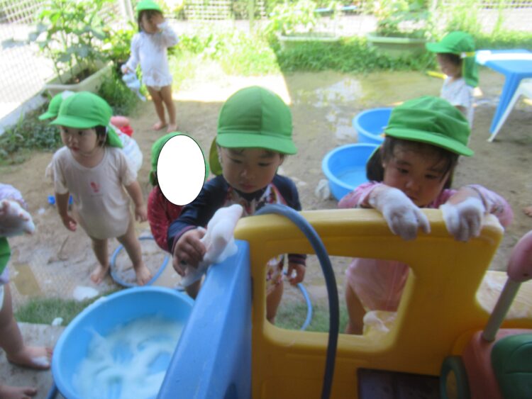 園庭では泡あそびに夢中です