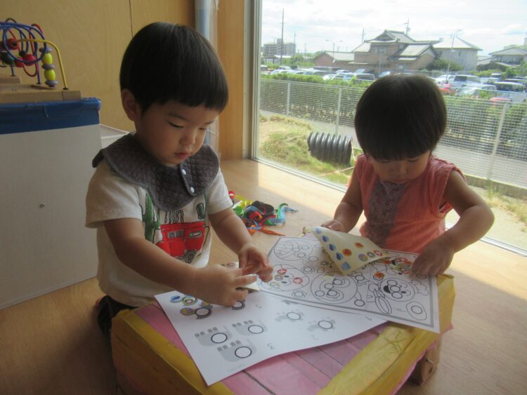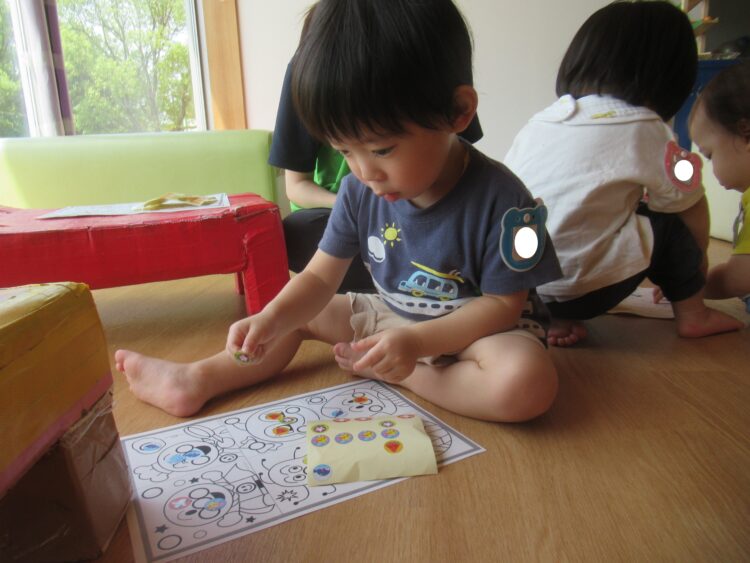その頃 室内では、真剣な表情でシール貼りに取り組んでいる子ども達を見つけましたよ![]()