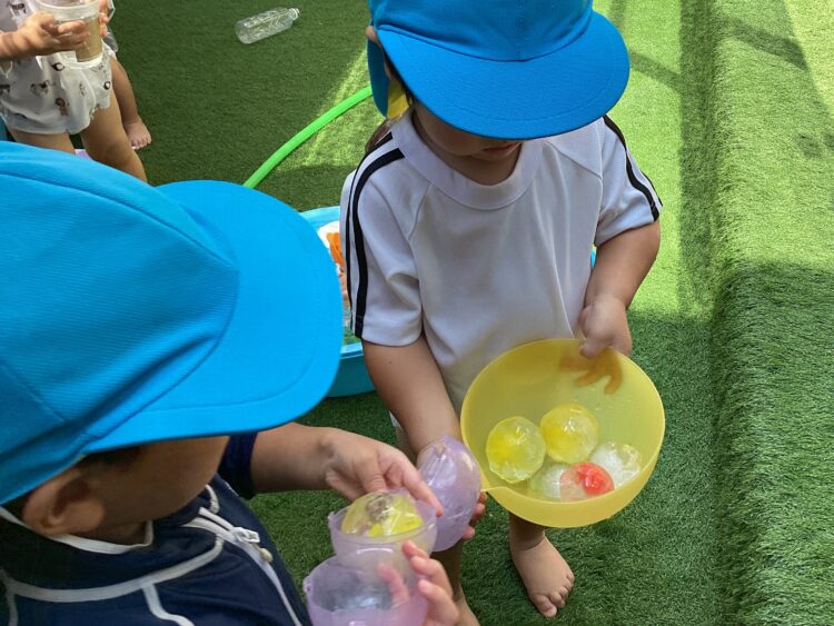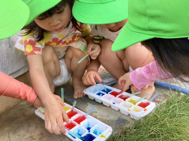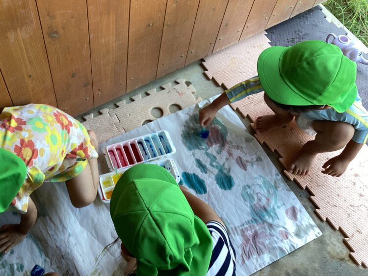 園庭では昨日人気だった色水氷でお絵描きをしましたよ![]()