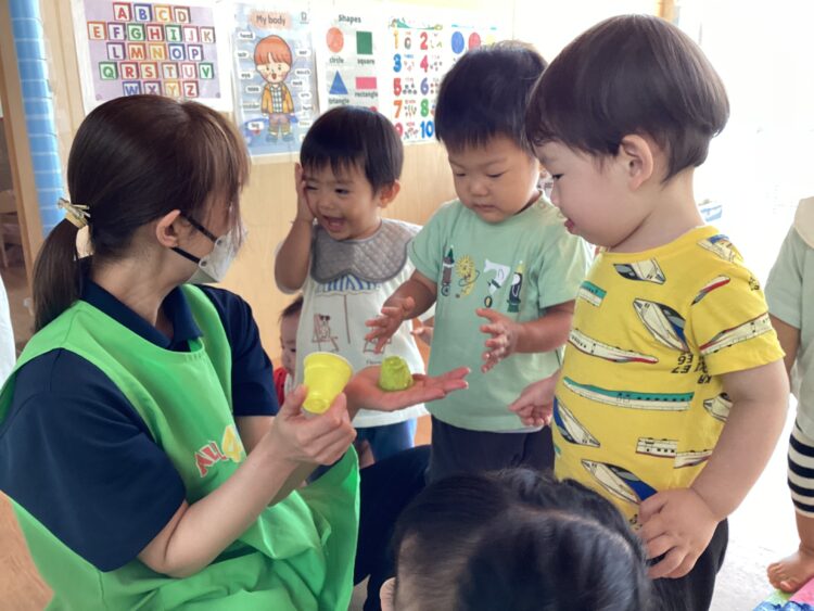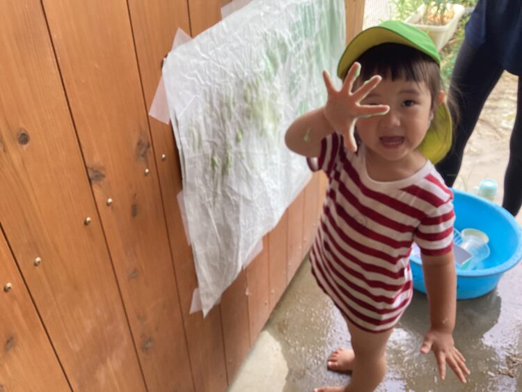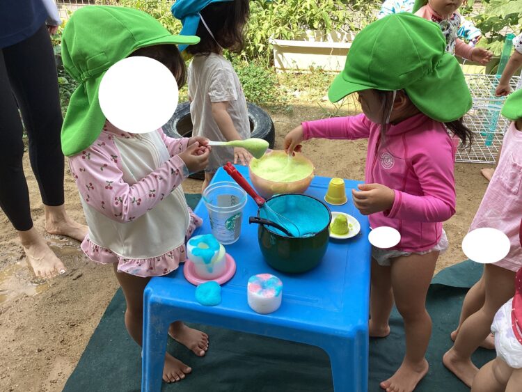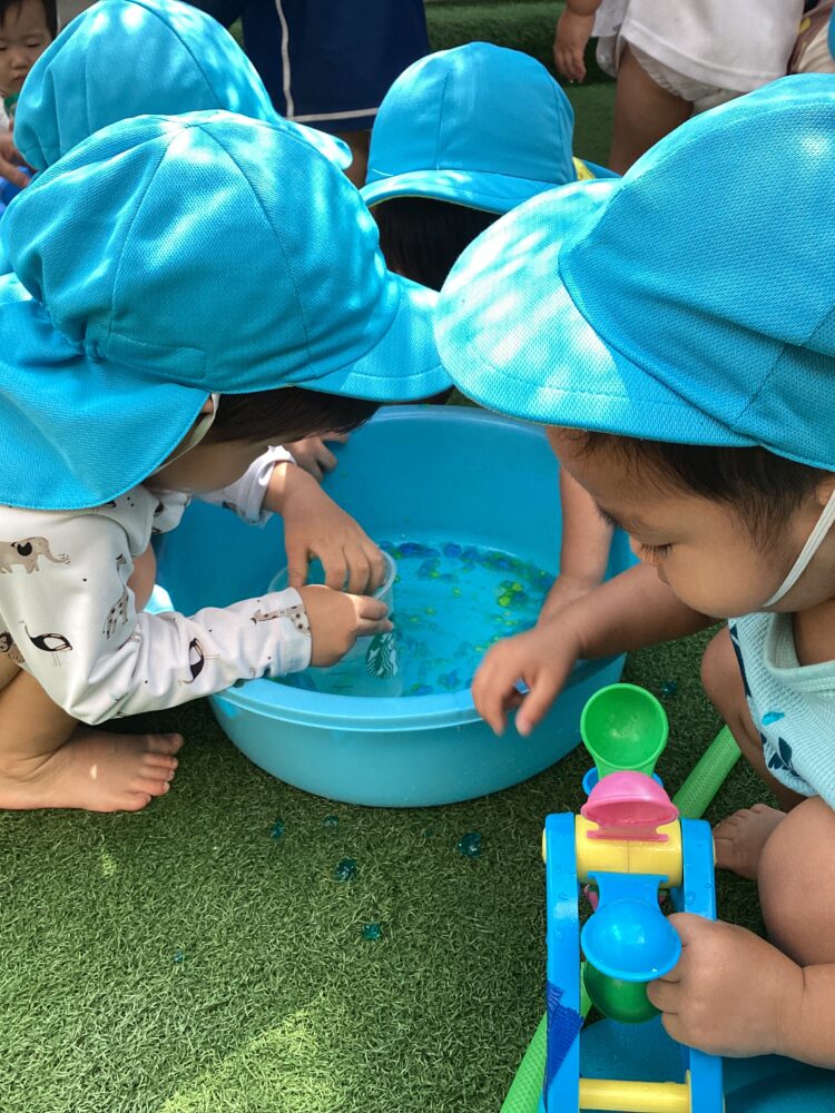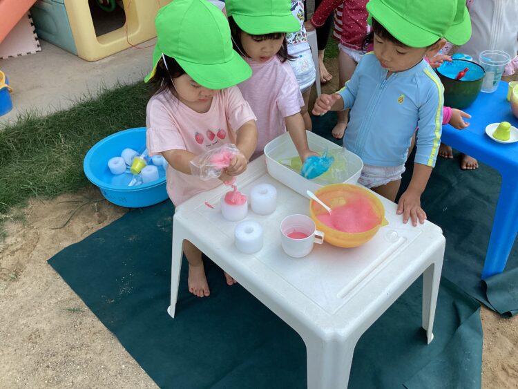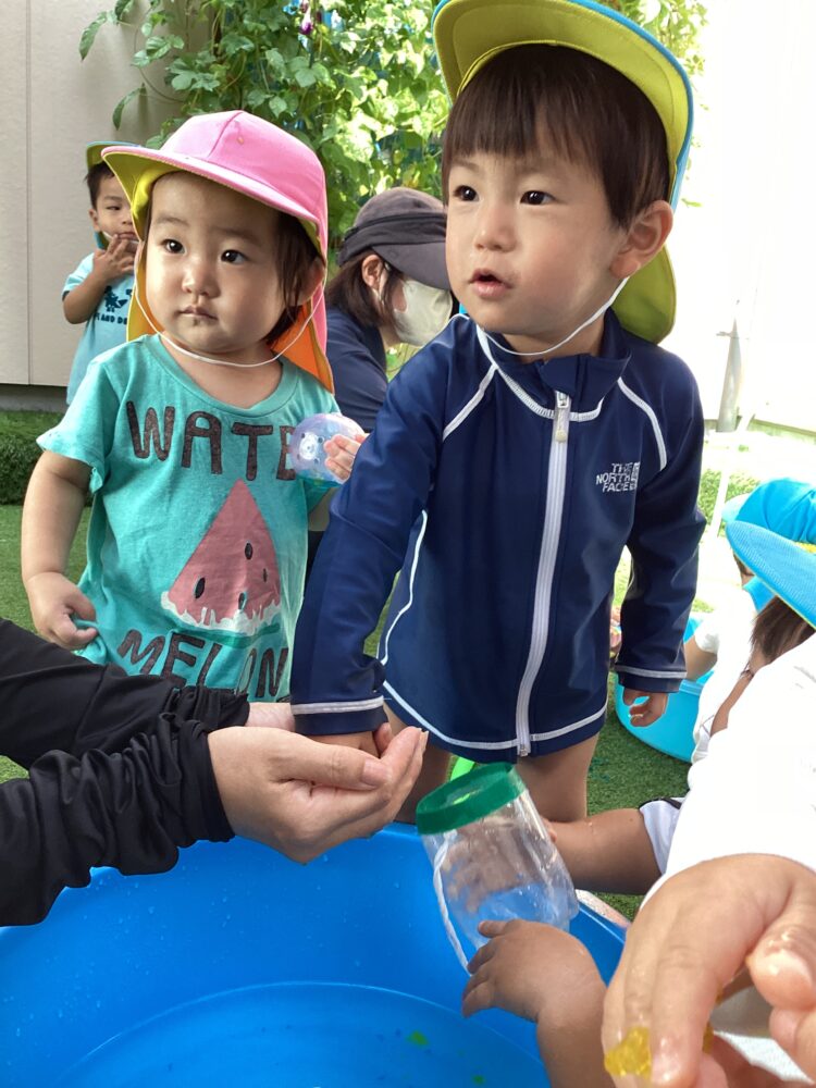 中庭では色付きの寒天でプルプルの感触を楽しんだよ![]()