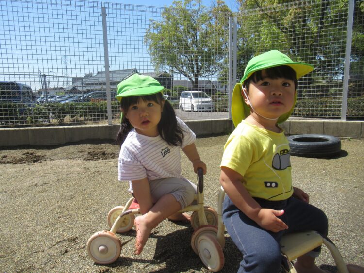 三輪車に乗って、園庭をドライブ![]()