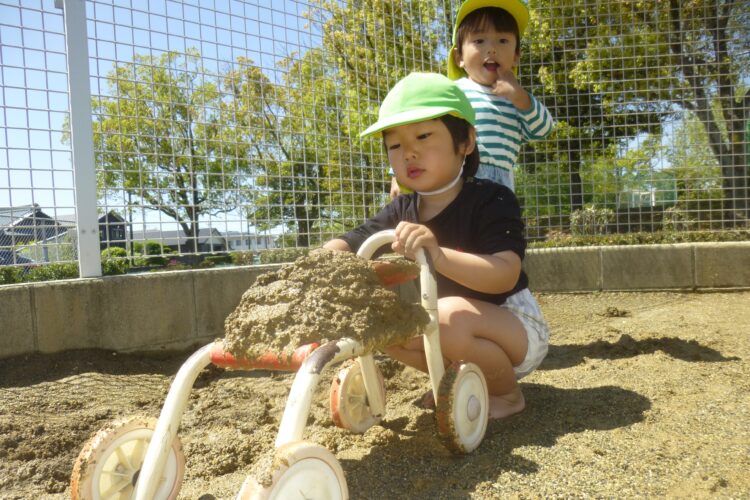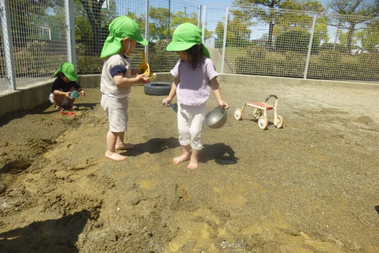園庭ではスコップを使い、集中して砂をすくったり、バケツに入れたりして砂遊びを楽しんでいました。