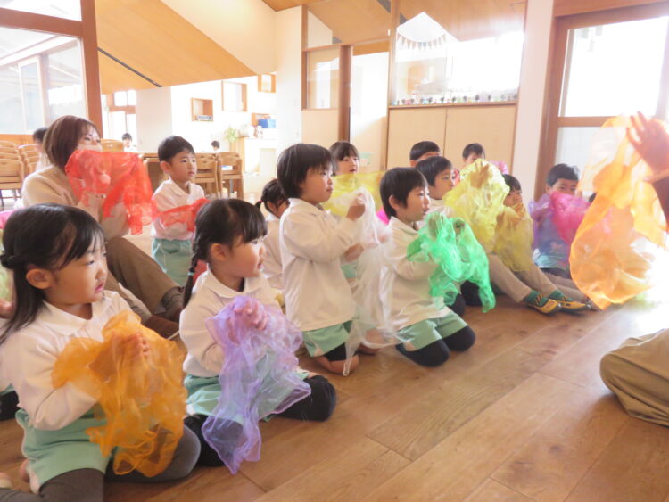 スカーフでお餅や獅子舞、凧揚げやコマ回しなどを表現しながら遊びました。