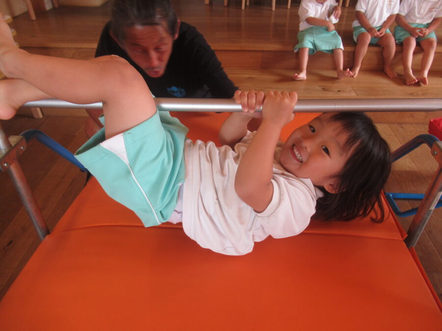 腕と足の力を使って鉄棒にぶら下がります![]()