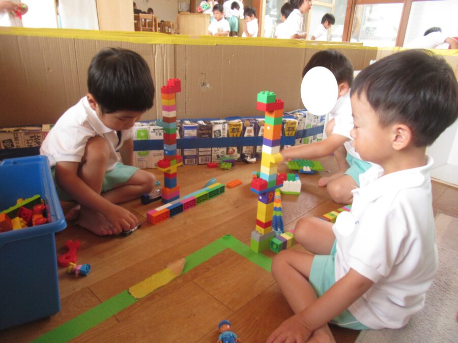 お部屋では、ブロックでお友だちと一緒に大好きな踏切を作って電車を走らせたり🚃