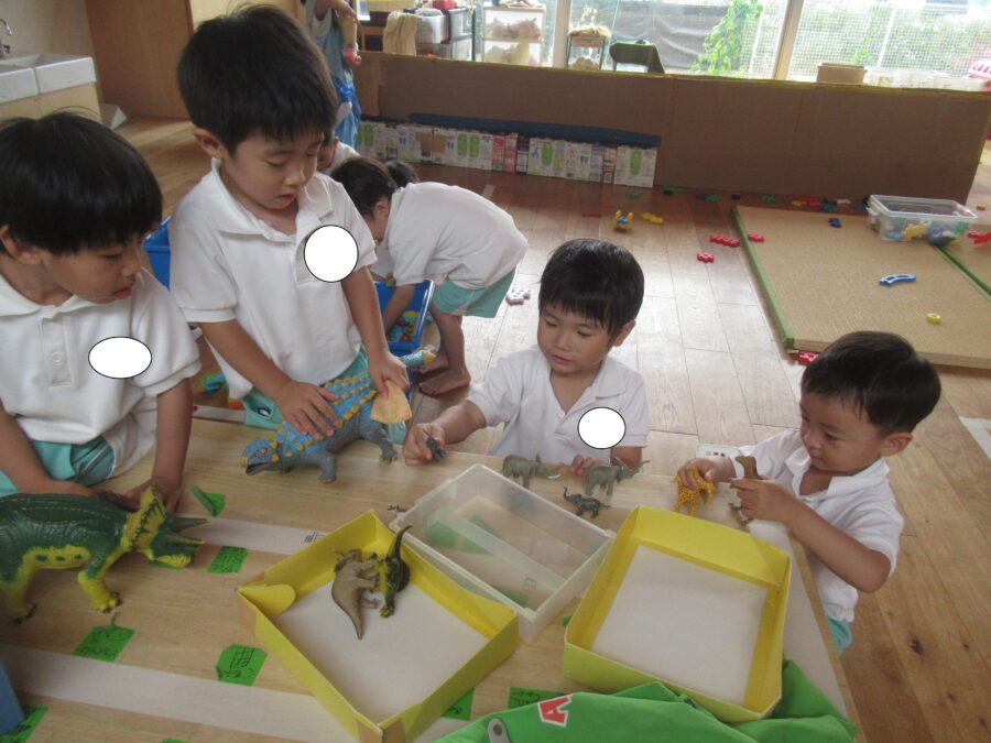 お部屋では、恐竜を並べて遊んだり、お話をしたりして楽しんでいました!