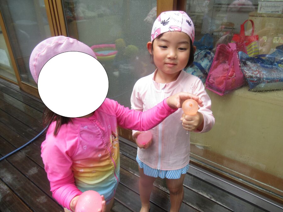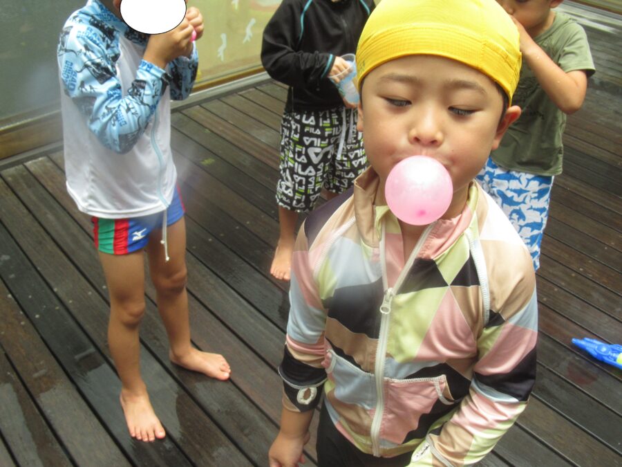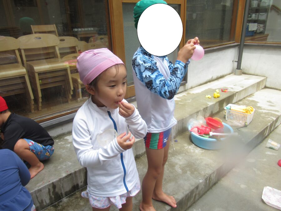 きらきらさんは、水風船を膨らますことに挑戦!