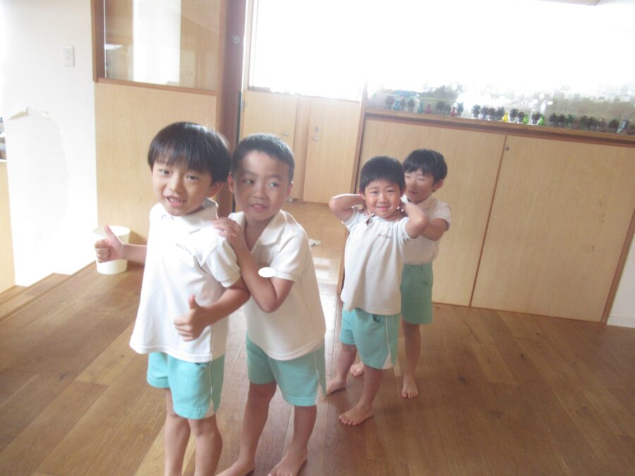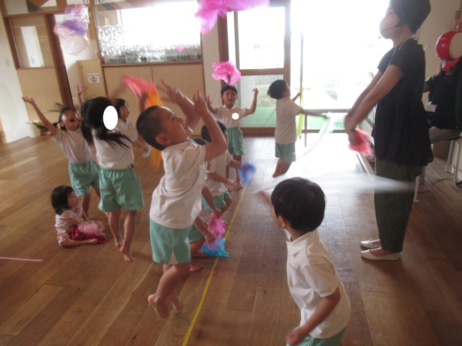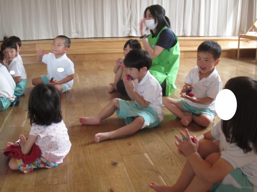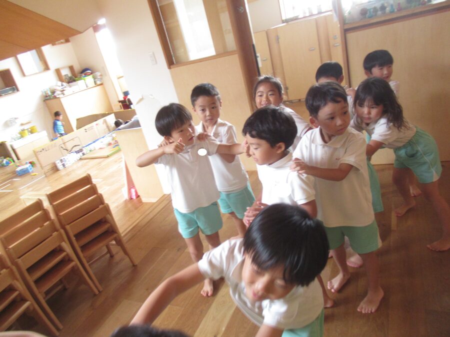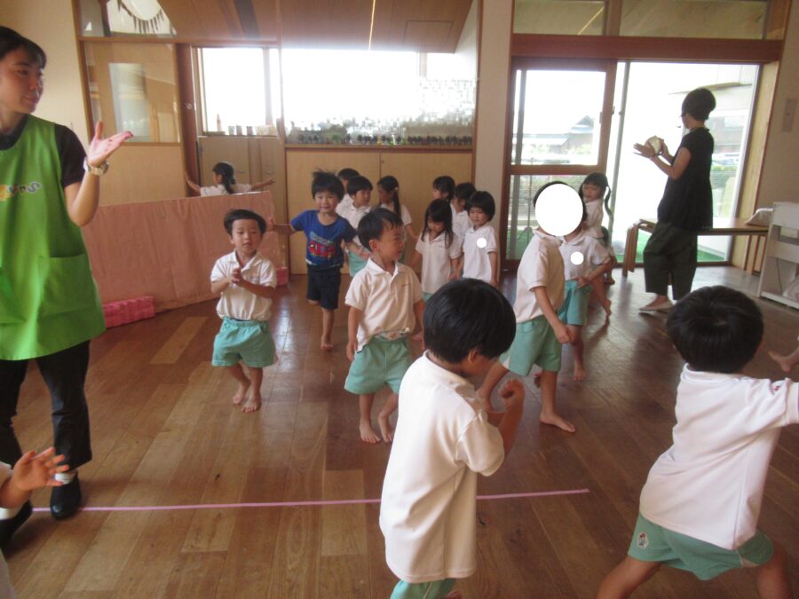 みんなで電車に変身して、音に合わせて歩いたり、止まったり