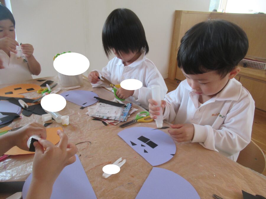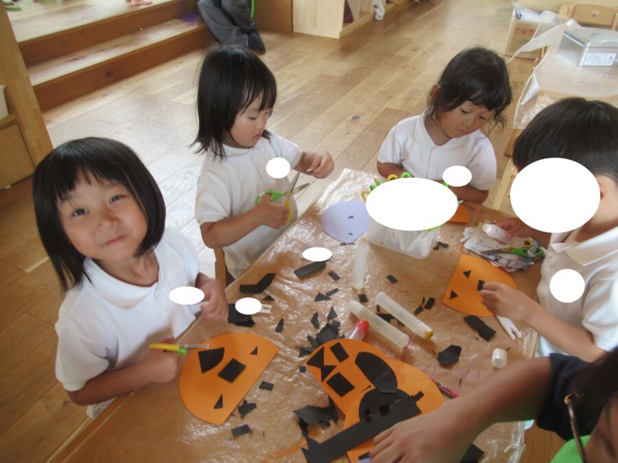 どきどきさんは「ぎざぎざにする!」「こわいめにする!」とイメージしながらはさみでチョキチョキ…!![]()