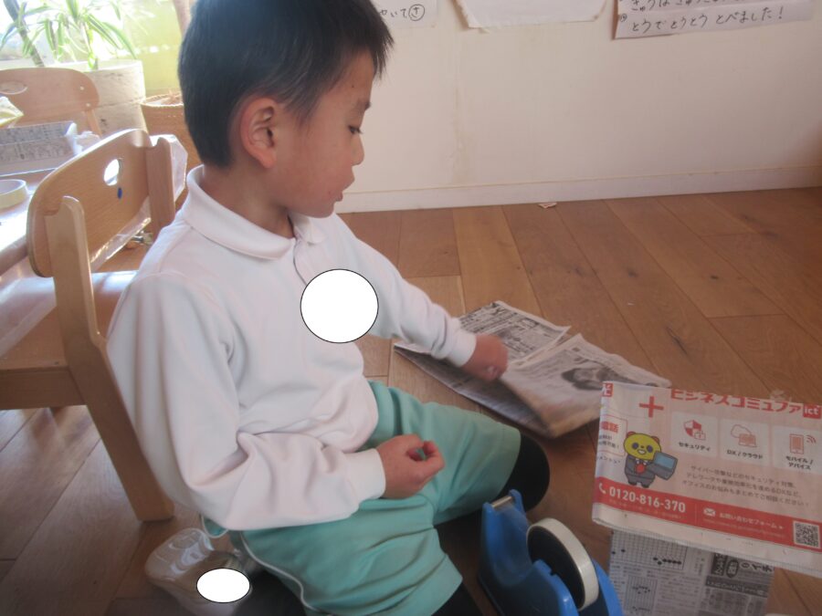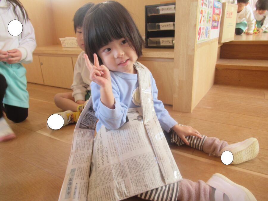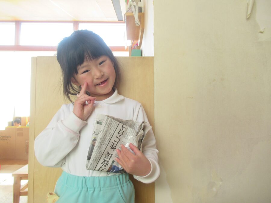 新聞紙でバックやお家、ステッキを作っていましたよ!