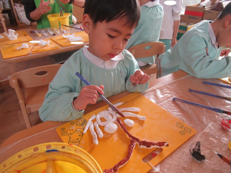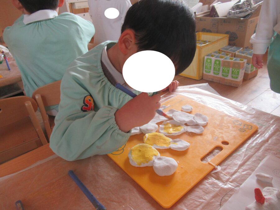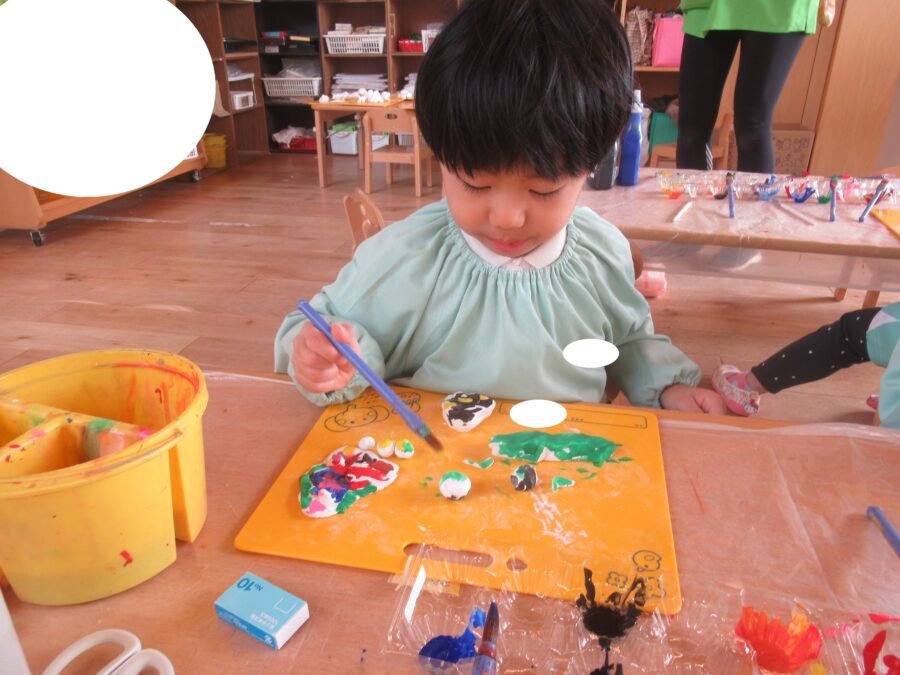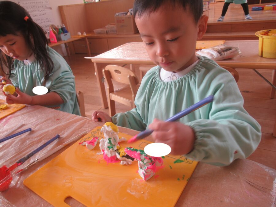 今日も紙粘土に色を塗っていきます![]()