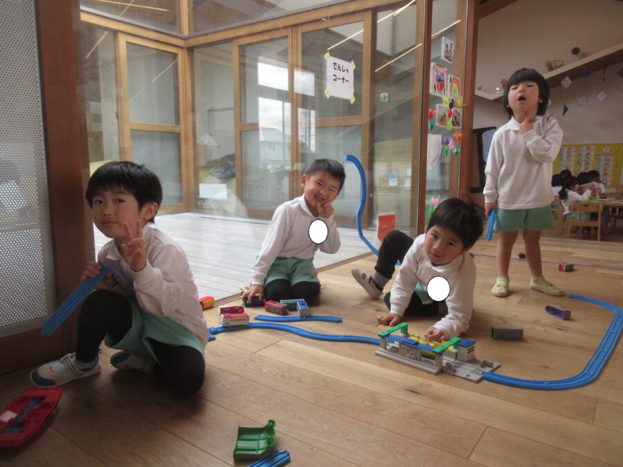 お部屋では、線路を長くつなげて電車を走らせたり・・・