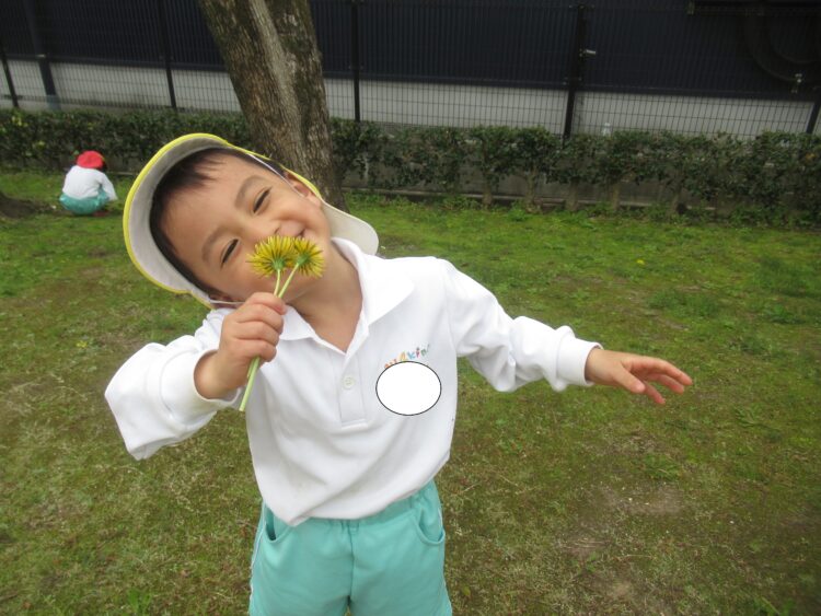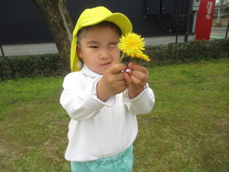 タンポポを見つけて満面の笑みです😊