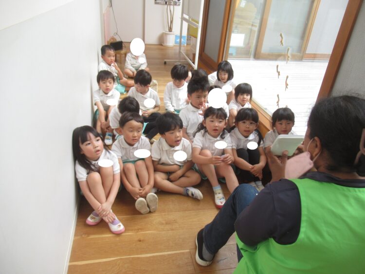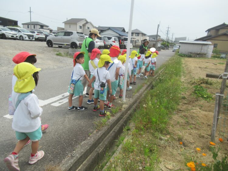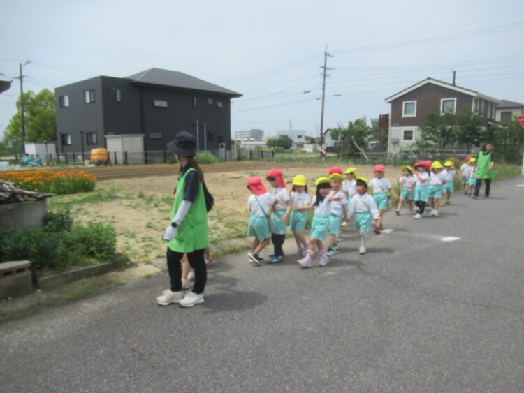 どきどきさん・きらきらさんは、園で夏野菜を育てるために近所の畑を見て観察を行いました![]()