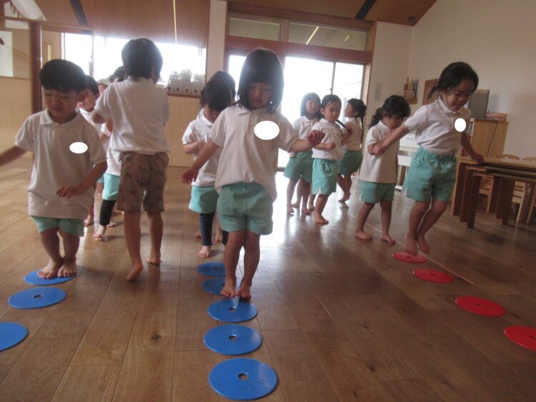 どきどきさんは、赤と青の印にあわせて小さくジャンプ!