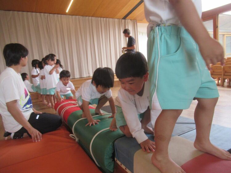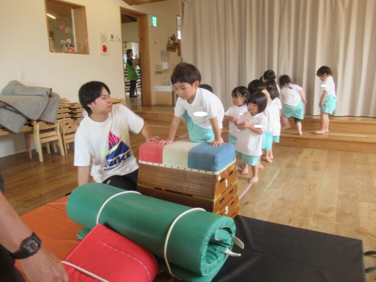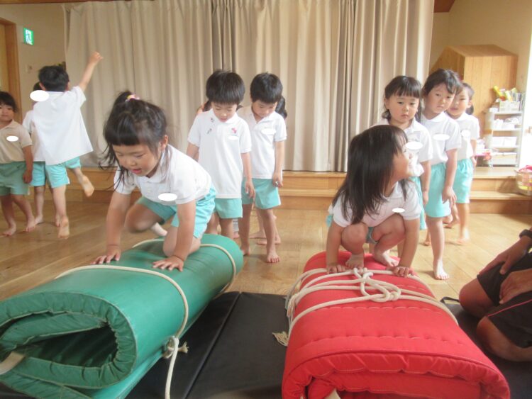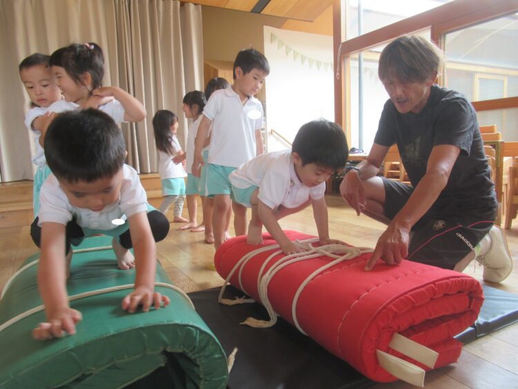 どきどきさんも挑戦!手をつく位置を教えてもらいながら、ヨイショ