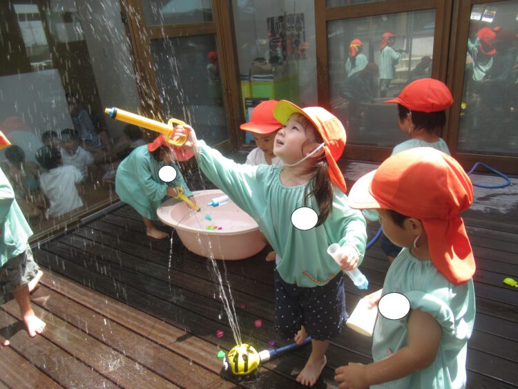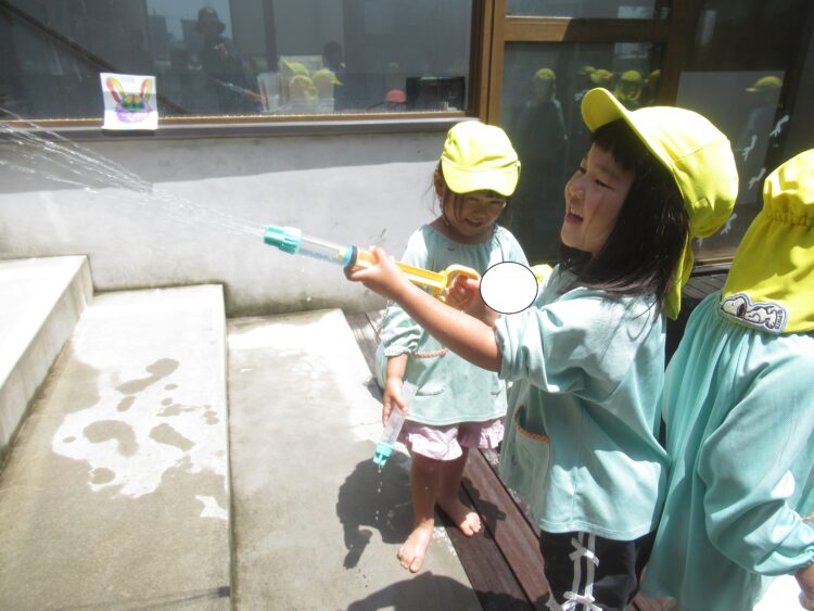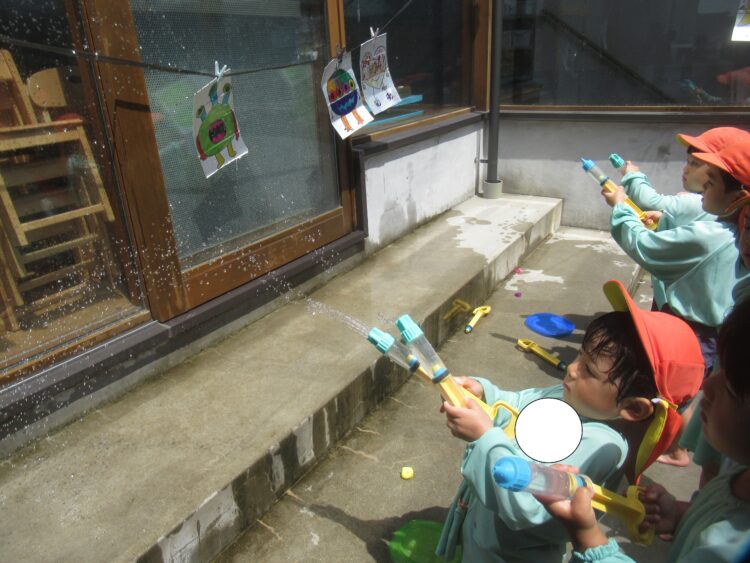 水鉄砲が人気で、的を狙って発射!当たると大喜び!