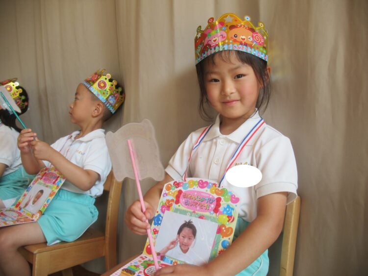 園長先生から、きらきらの冠と誕生日カードをもらって嬉しそう![]()