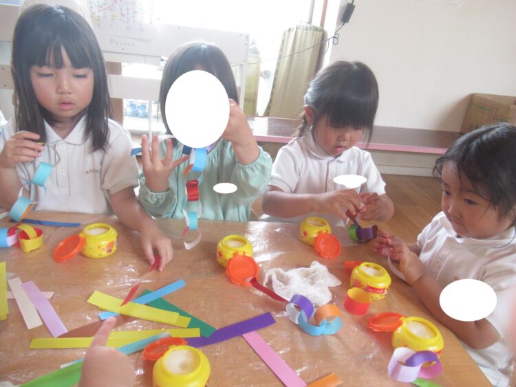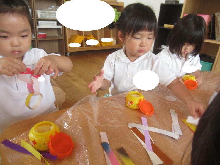笹飾りを作り始めたどきどきさんを見て、「やりたい!!」といって、わくわくさんも一緒に楽しんでのりでペタン![]()
