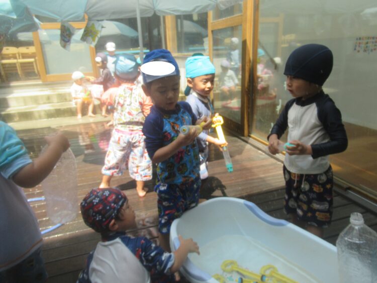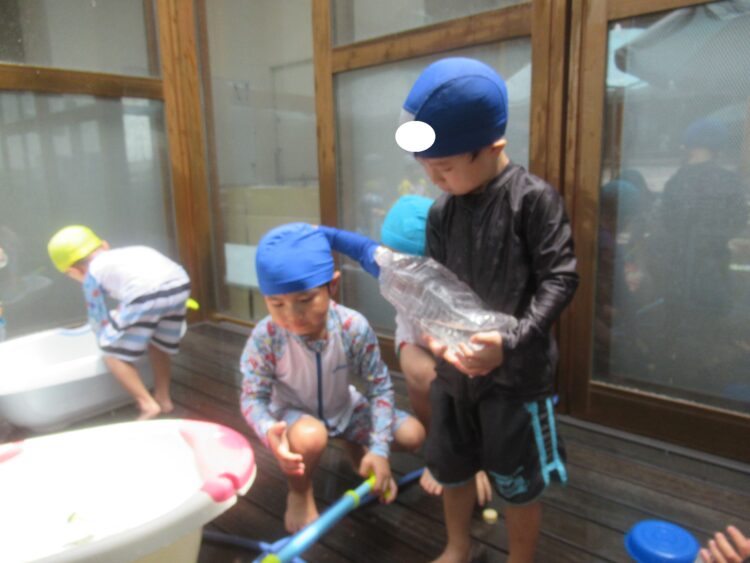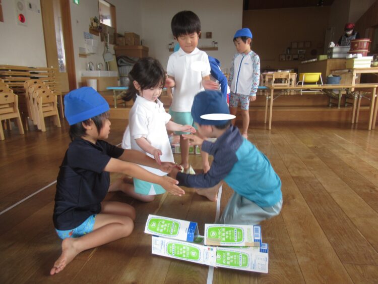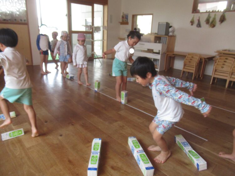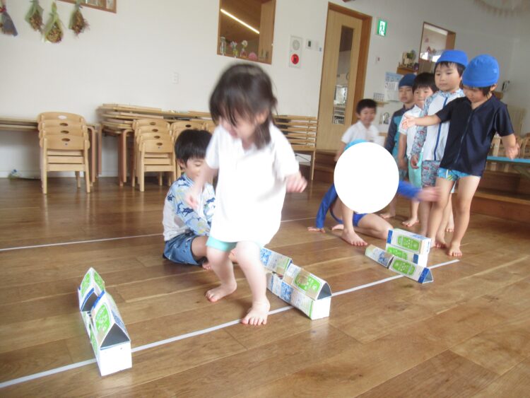 今日は、室内遊びと水遊びをしました!牛乳パックをとんだり、またいだり・・・