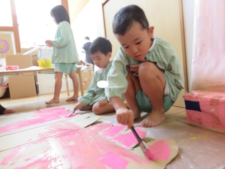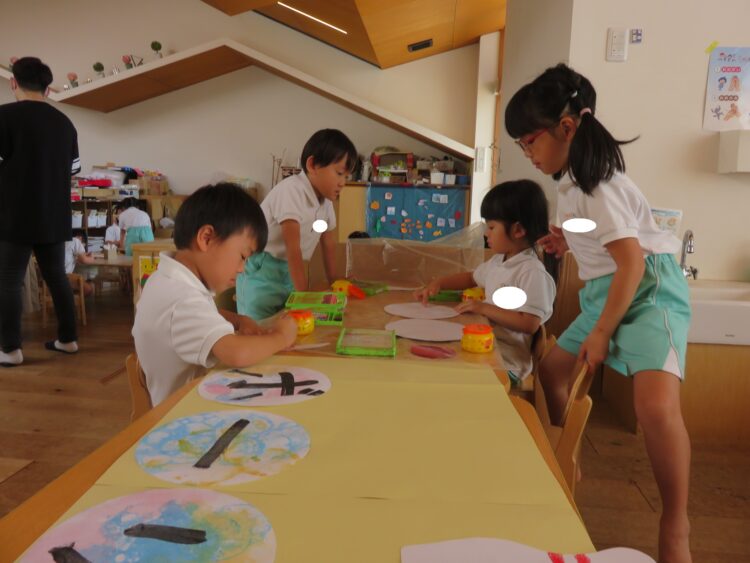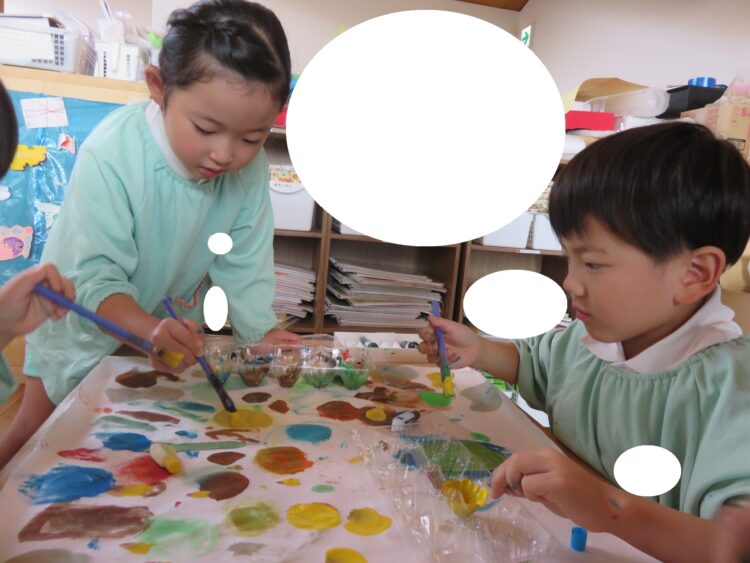 糊付けや絵の具など、いろいろな素材を使って製作を楽しむ子どもたち。