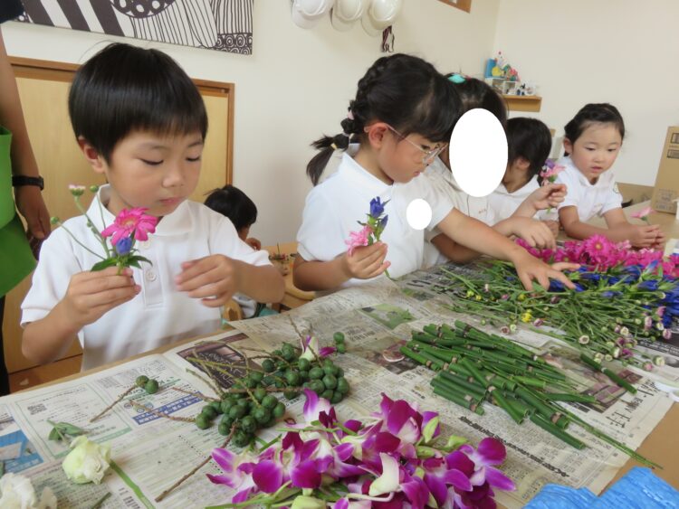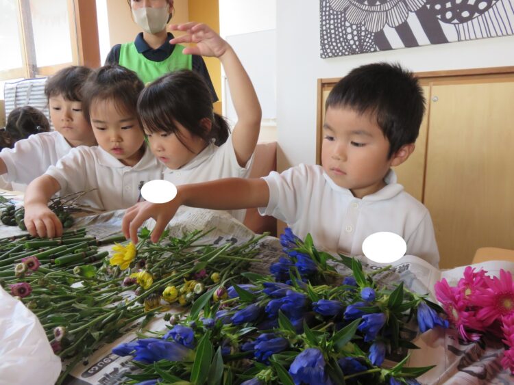 リンドウ・スプレーマム・ガーベラ・トクサ・デンファレ・トルコキキョウ・カーネーション・ナンキンハゼ・グロリオサ