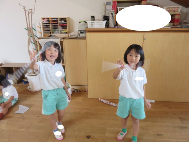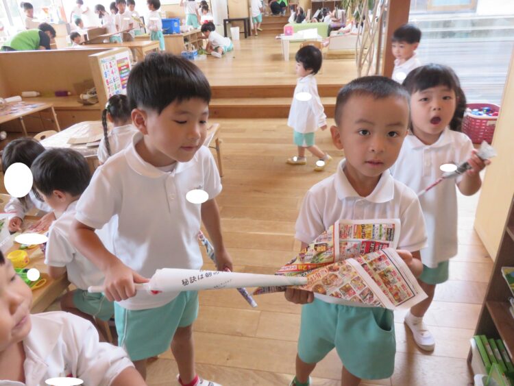 今日もお部屋で過ごしましたよ昨日の続きで、広告を細く長く丸めてみようと、何度か挑戦してみる姿がありました!ステッキ、剣といれもの、新聞で魔女のほうきもできたね