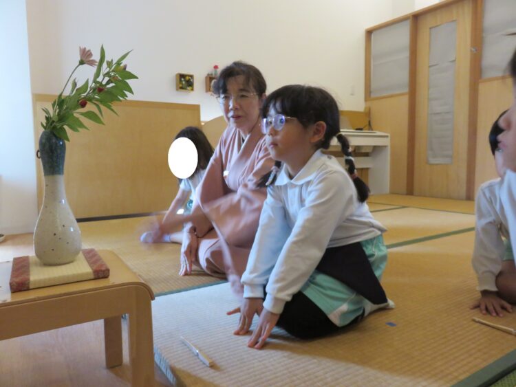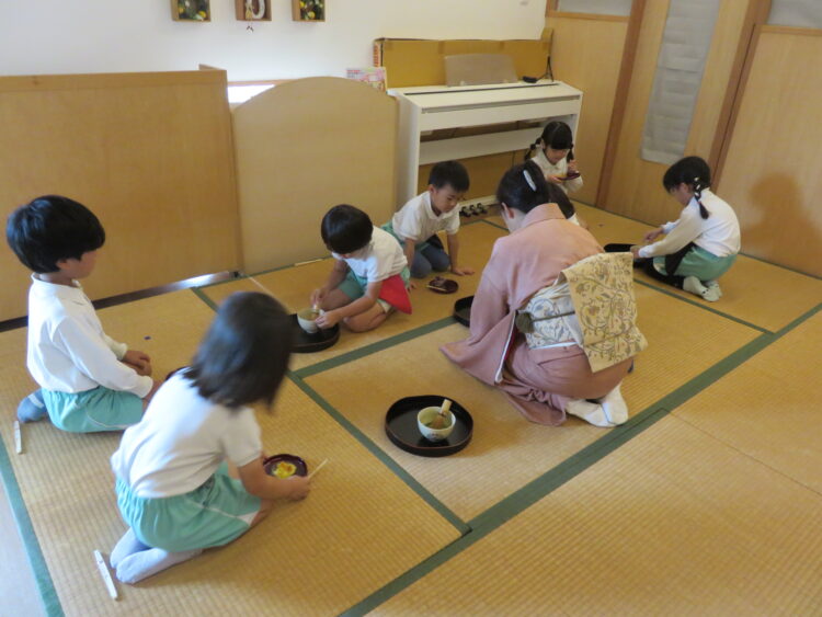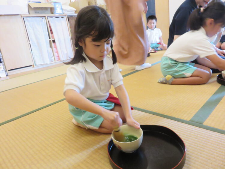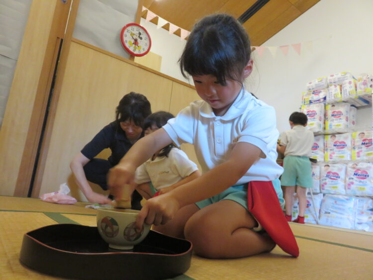 友だち同士でおもてなしをしていると、「最後はのの字だよね。」と前に習ったことを思い出しながら、頑張ってお抹茶をたてる姿が見られました。