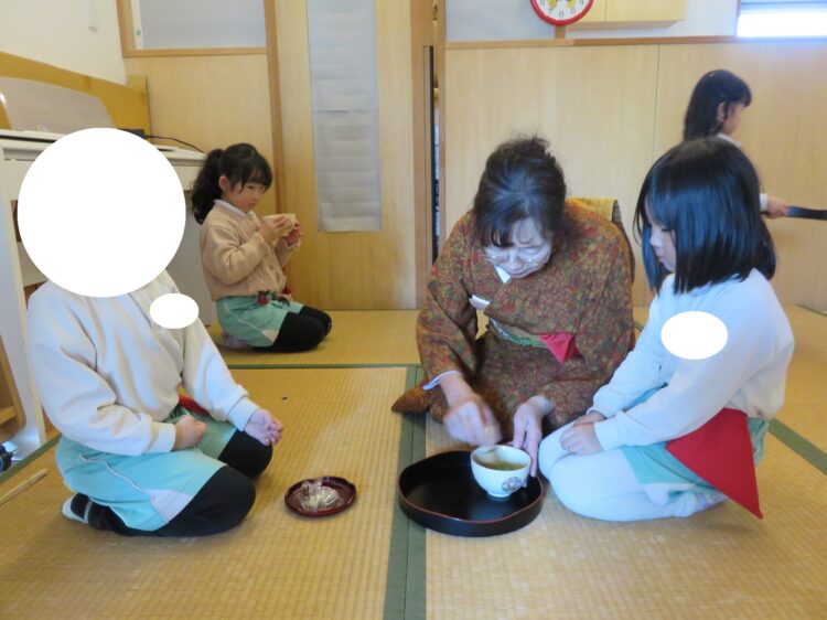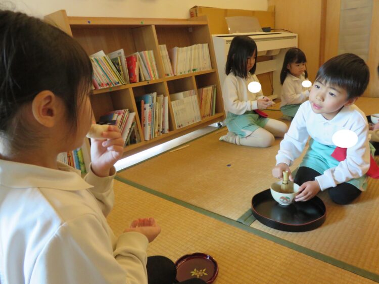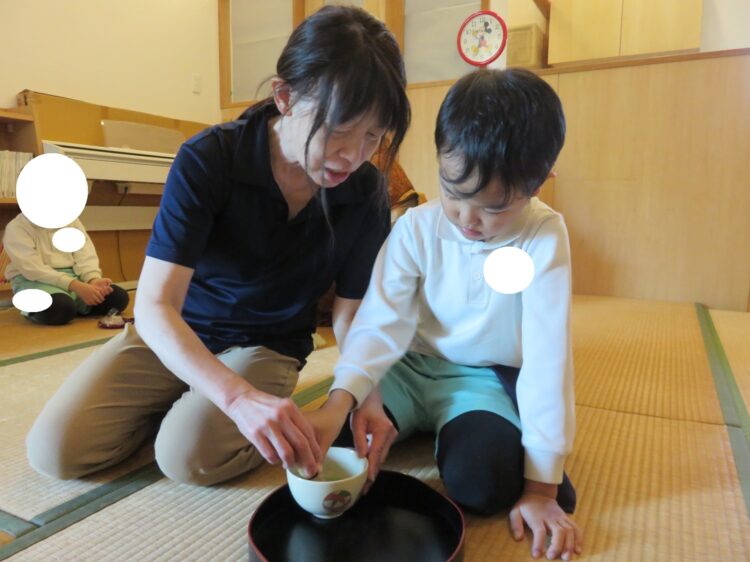 お友だちの表情を見ながら丁寧にお茶をたてるお友だち✨園長先生や講師の先生と一緒に真剣なまなざしで活動していました卒園式のお茶会まで残り2回